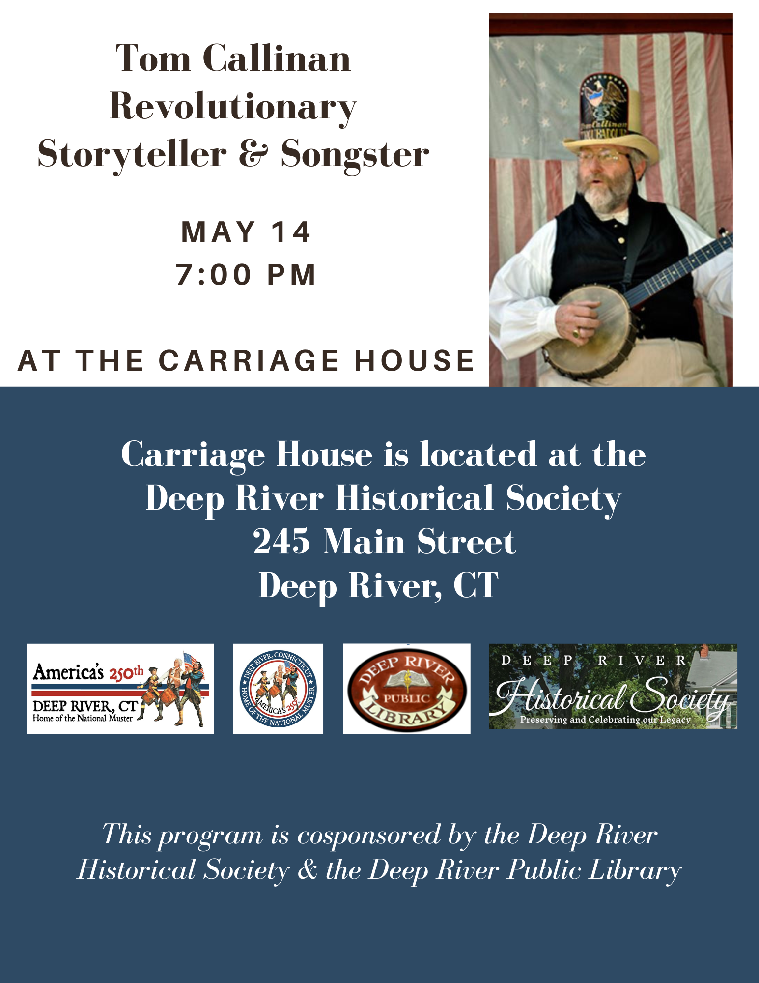 Deep River Historical Society NEW DATE!March 27, 2026, 7pmCarriage House, 245 Main St. “Billy Winter’s Neighborhood” Billy Winter, a self emancipated slave who made his home here, and the other black families who came to make their own contributions to Deep River.